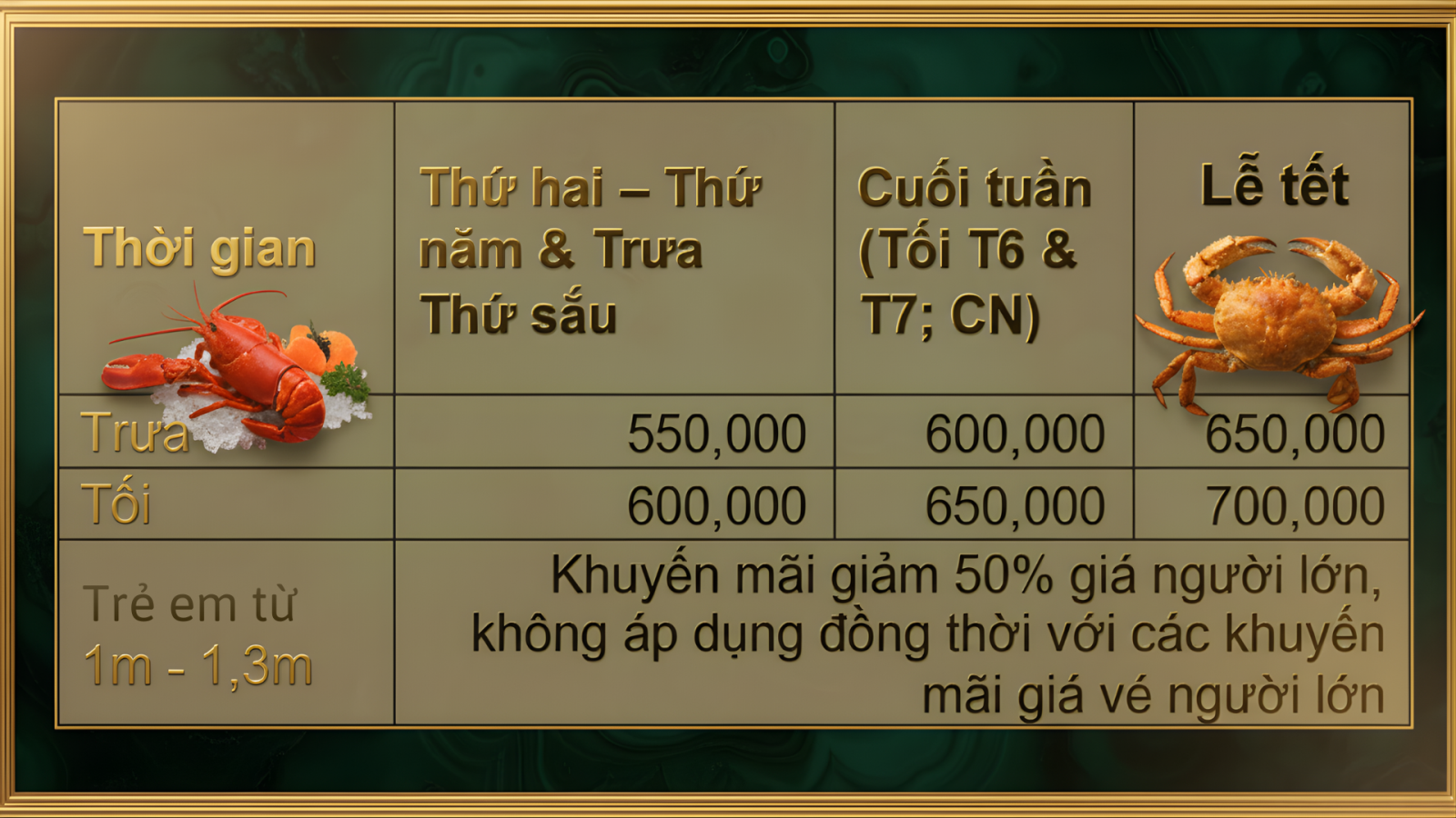 Vị biển tươi mới – Hồn Việt ngàn năm không chỉ là slogan, mà là triết lý vận hành của chúng tôi. Mỗi món ăn tại Le Buffet d’Annam là một sự giao thoa hài hoà giữa nguyên liệu hải sản tươi sống từ biển Việt Nam và tinh hoa chế biến Á – Âu theo tiêu chuẩn 5 sao. Tại đây, vị tươi ngon, xanh sạch của biển cả được nâng tầm bằng kỹ thuật chế biến ẩm thực quốc tế, nhưng vẫn lưu giữ linh hồn bản địa — vừa quen thuộc, vừa mới mẻ.